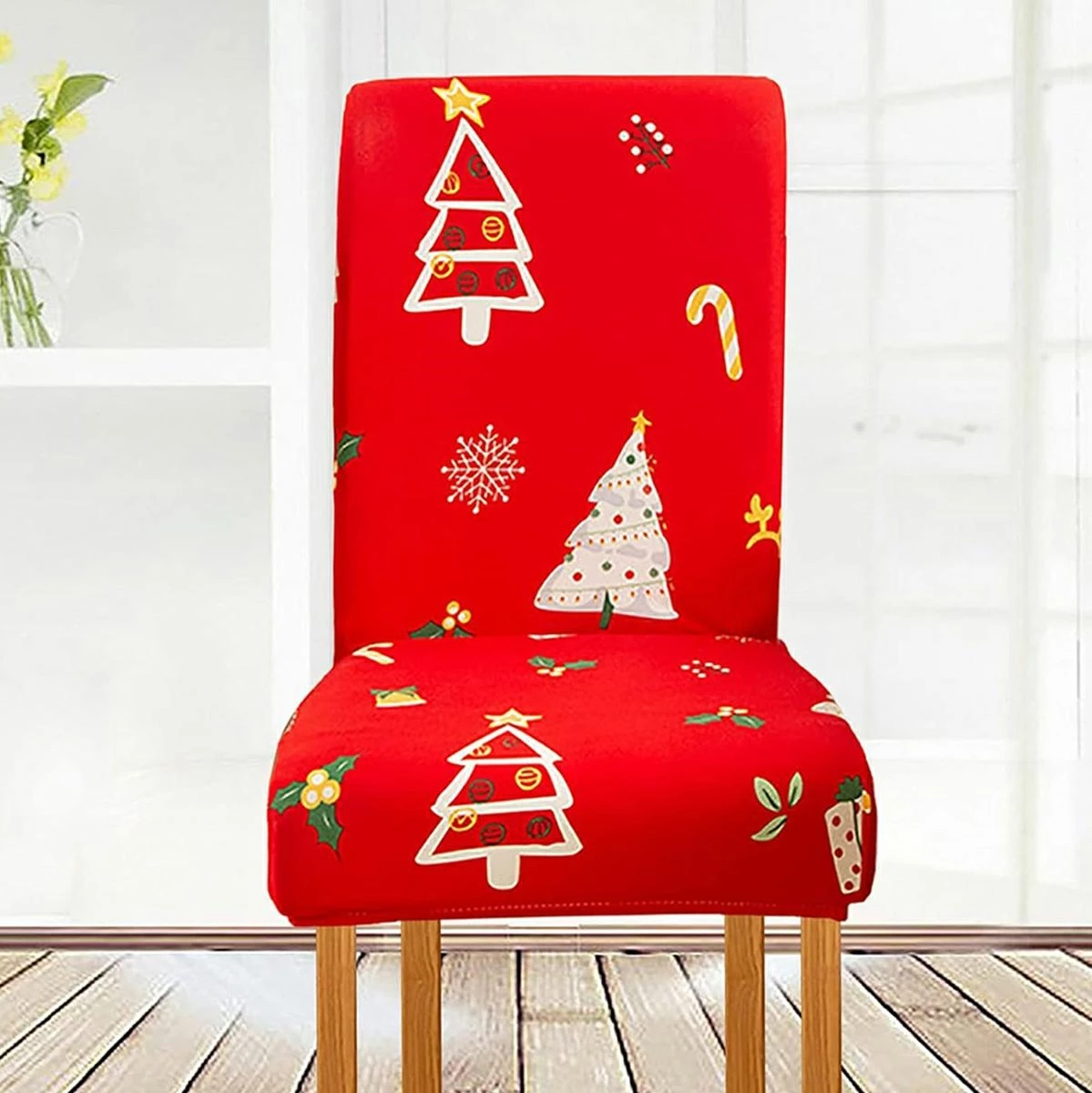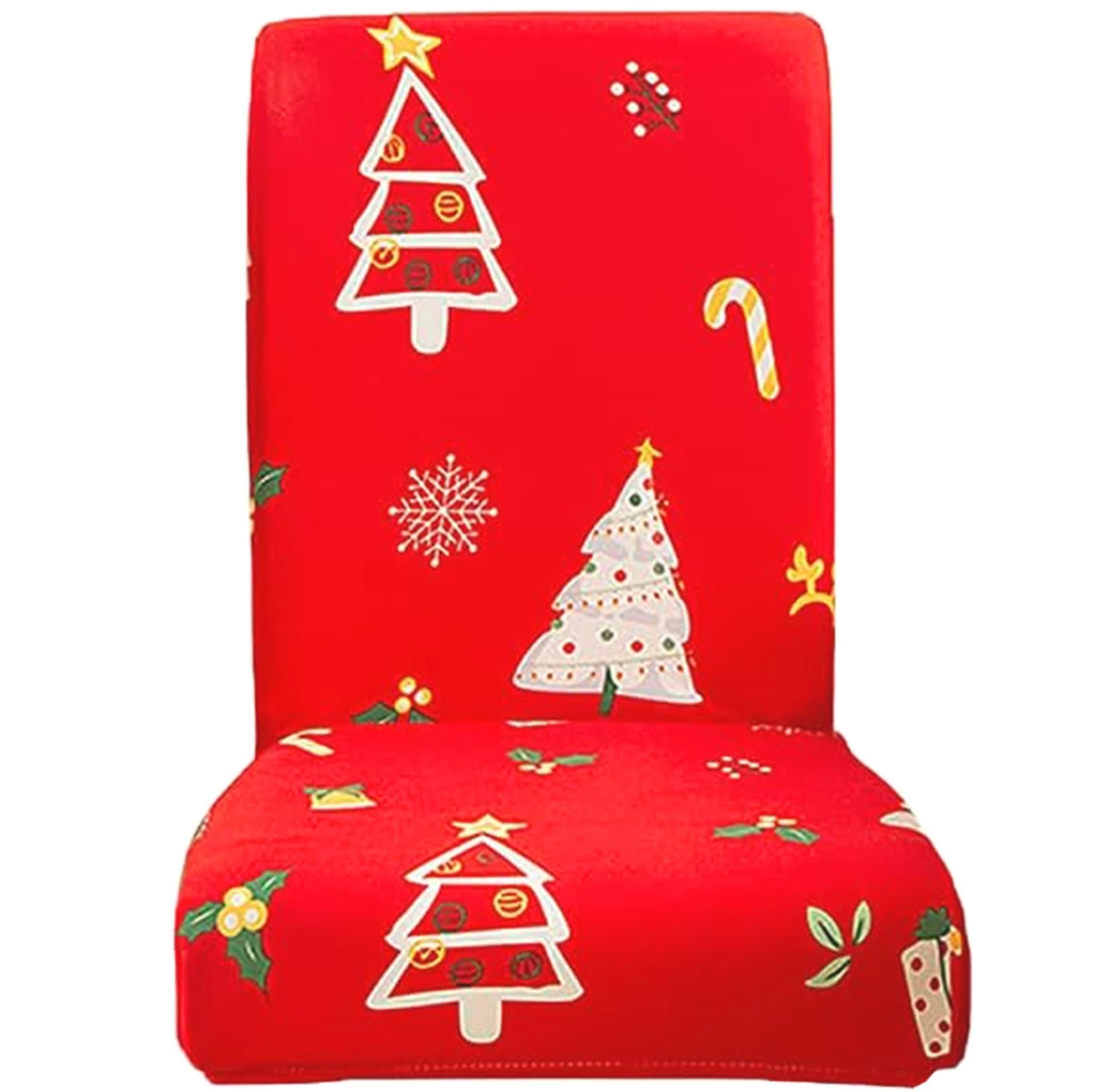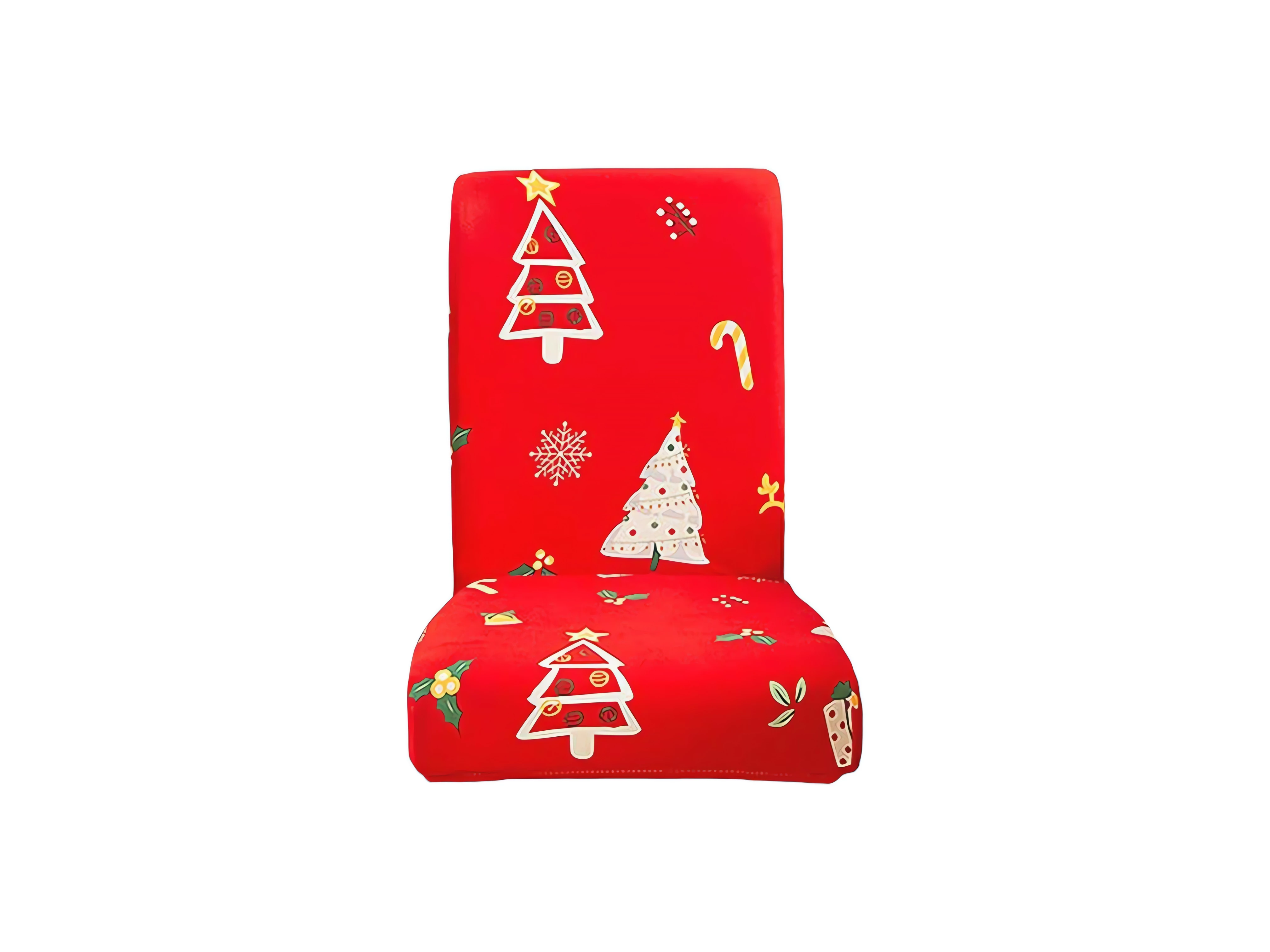 Univerzálny poťah na stoličky. Vyrobený z mäkkého materiálu pripomínajúceho zamat. Vďaka vysokej elasticite sa ľahko prispôsobí sedadlu a operadlu rôznych typov stoličiek. Možno prať v práčke (pri 30 °C). Atraktívny vianočný motív (Vianočné stromčeky).