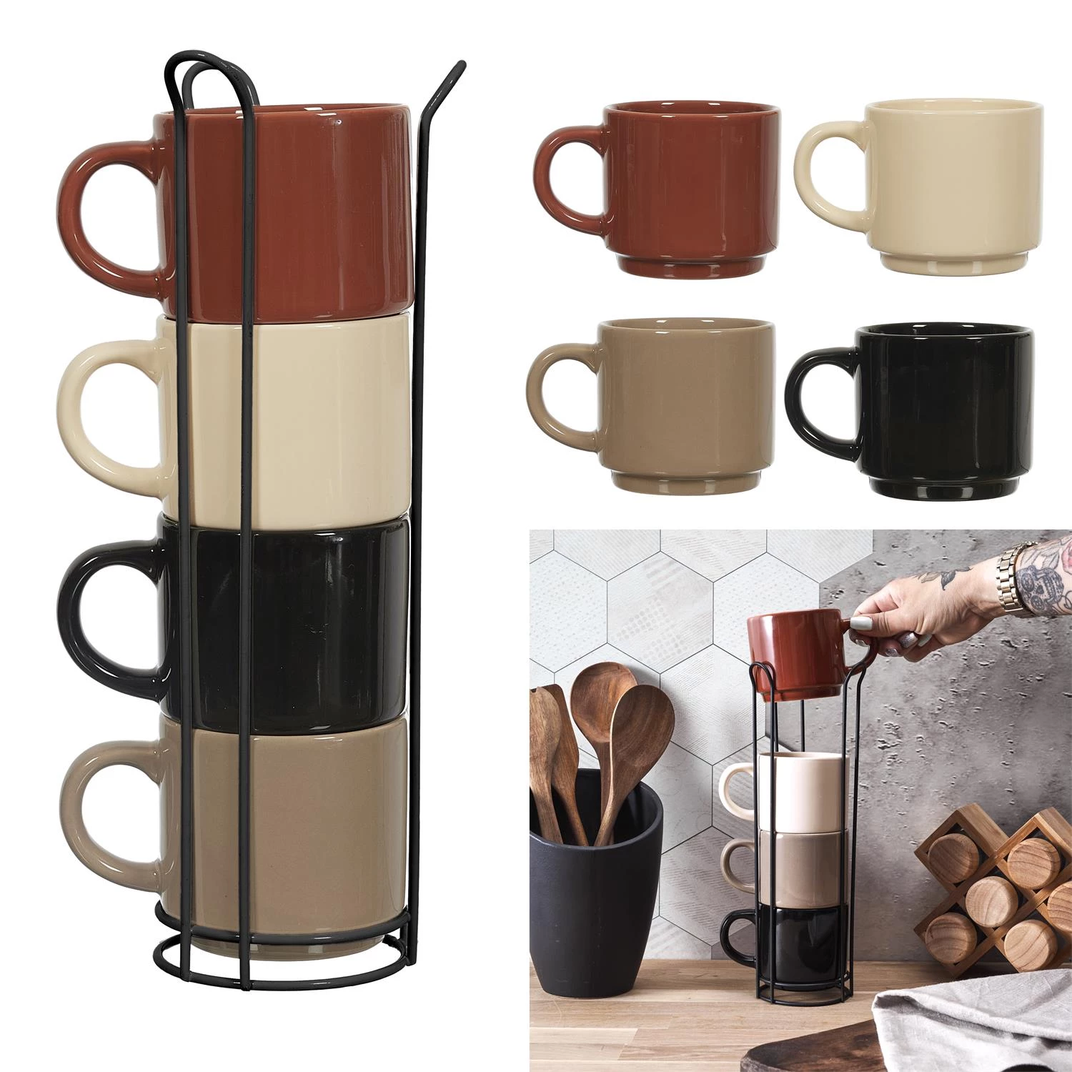 Vneste do svojej kuchyne štýl a praktickosť s touto elegantnou sadou keramických hrnčekov v prírodných tónoch. Súprava obsahuje štyri farebne zladené hrnčeky (hrdzavočervený, béžový, čierny a svetlohnedý), ktoré sa ľahko zložia do priloženého kovového stojana. Vertikálne uloženie šetrí miesto a vytvára dizajnový prvok na kuchynskej linke alebo v jedálni. Ideálne na každodenné používanie a servírovanie kávy hosťom.