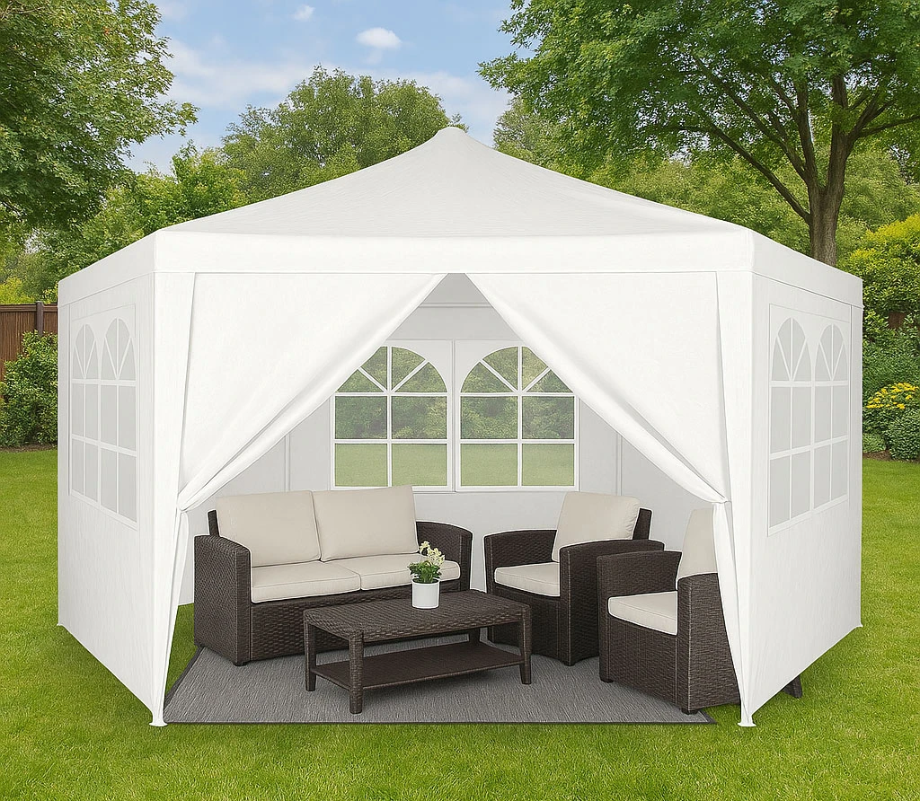 Záhradný stan MultiGarden je praktický a pohodlný prístrešok na záhradu, chatu aj vonkajšie podujatia. Ľahká, no stabilná konštrukcia poskytuje istotu pri rodinných stretnutiach, záhradných oslavách či ako mobilné zázemie pre predajcov a organizátorov. Odolná PE tkanina chráni pred slnkom aj dažďom a veľké okná zabezpečujú svetlý a príjemný interiér. Vstup je uzatvárateľný na zips pre rýchly a pohodlný prístup.