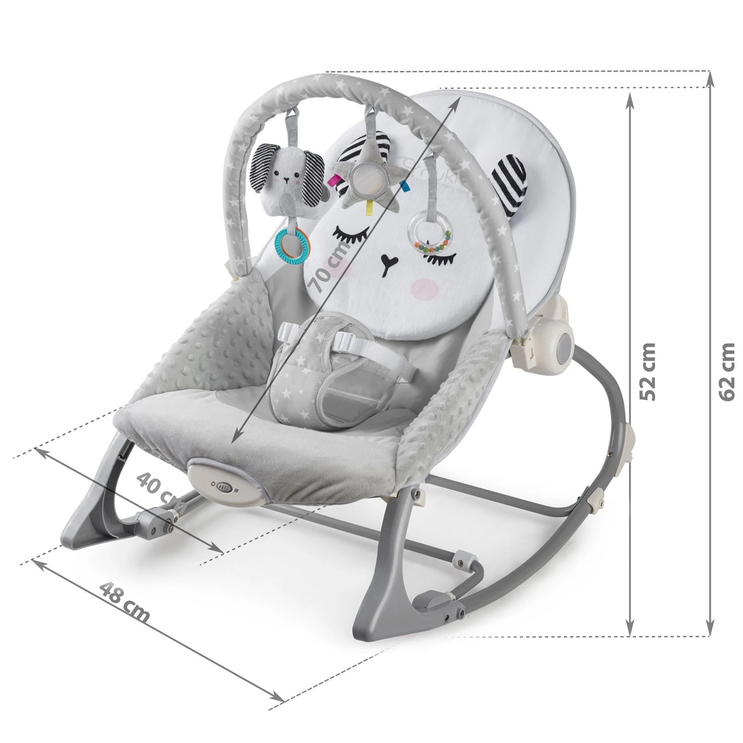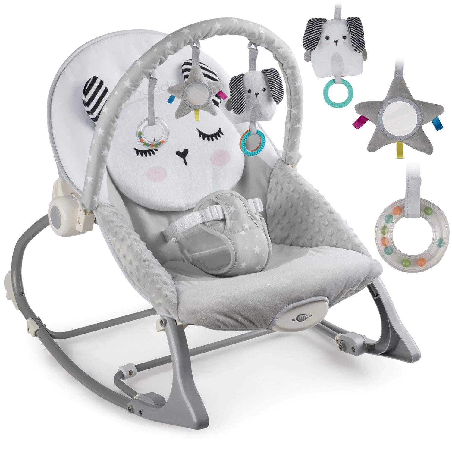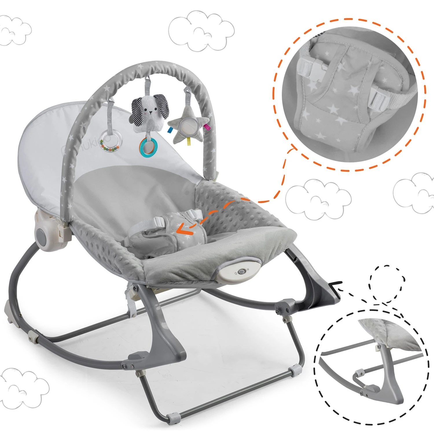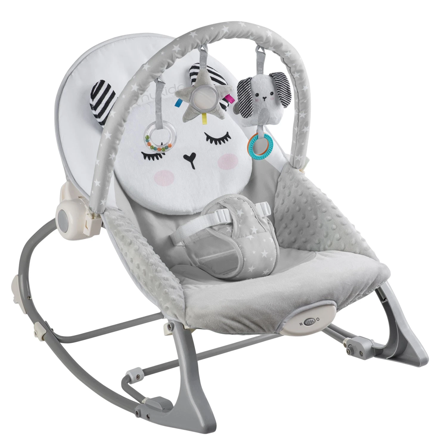 Multifunkčné ležadlo–hojdátko s vibráciou Nukido je navrhnuté ako praktická pomoc pri starostlivosti o bábätko. Elegantná sivá farba dopĺňa funkcie, ktoré dieťa upokoja, uľahčia mu zaspávanie a zároveň ponúknu zmysluplnú zábavu vďaka priloženým hračkám.