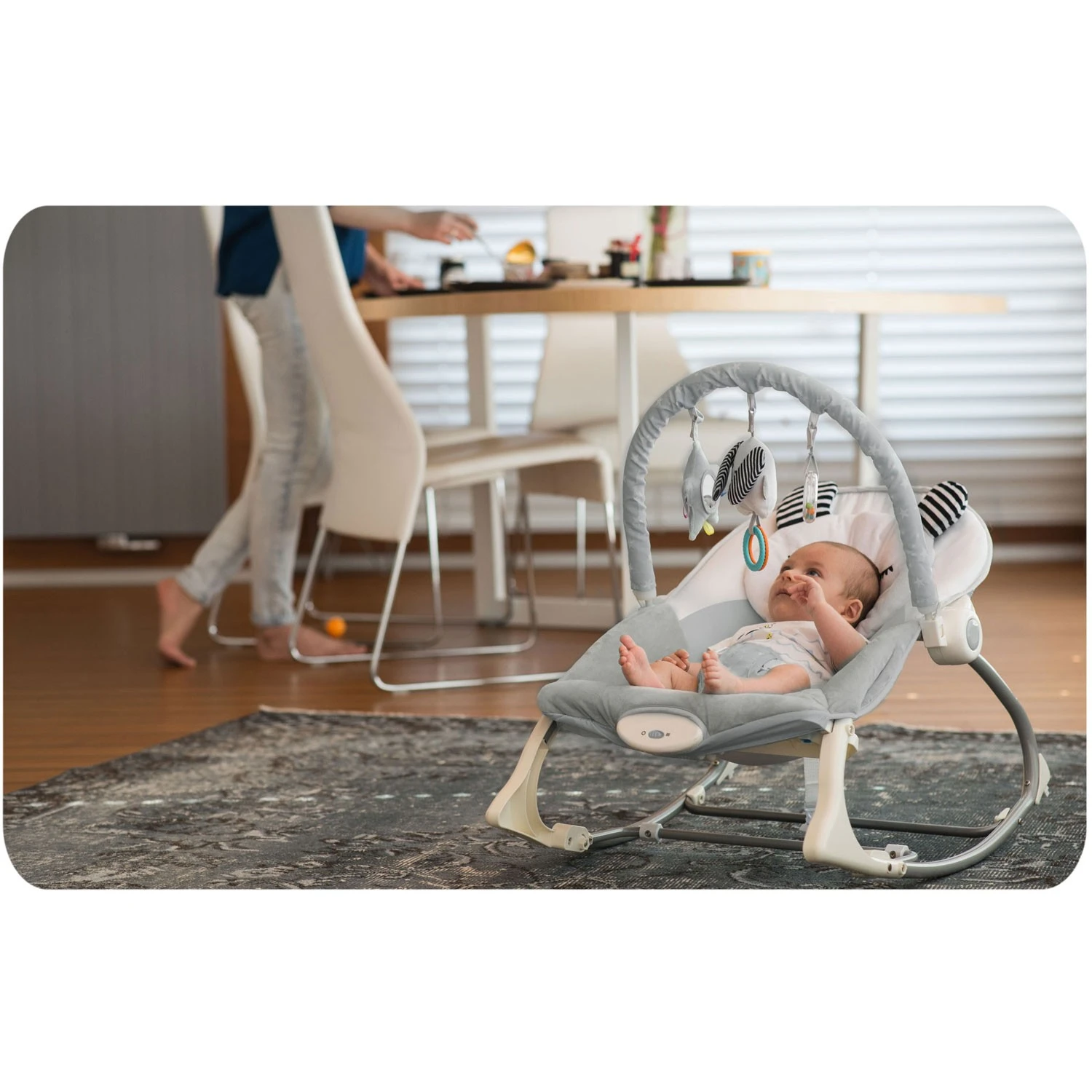 Ležadlo využijete, keď potrebujete rýchlo vybaviť telefonát alebo prevziať zásielku. Stačí bábätko pohodlne uložiť a zapnúť vibrácie. Na hravé chvíle slúži odnímateľná hrazdička so šuštiacimi zvieratkami na suchý zips. Hračky stimulujú zrak aj hmat a ich poradie môžete jednoducho meniť alebo ich dočasne sňať.