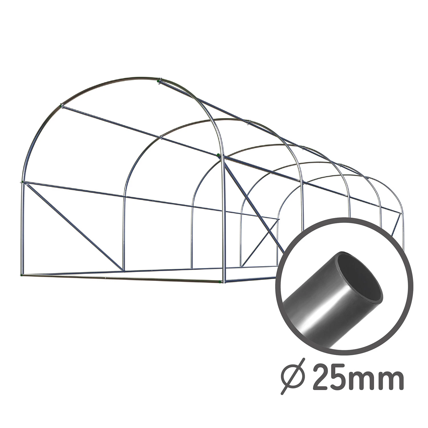 Polytunel Plonos s plochou 9 m² je praktickým riešením pre pestovanie rastlín v záhrade. Vďaka použitiu najnovších technológií a kvalitných materiálov je navrhnutý tak, aby rastlinám poskytoval ochranu a vhodné podmienky po mnoho sezón. Konštrukcia z obojstranne pozinkovaných oceľových profilov s priemerom 19 mm je doplnená dvojitými profilmi v hornej časti, ktoré zvyšujú stabilitu celého tunela. Zelená PE fólia s hmotnosťou 140 g/m² (UV4 proof) má nízky koeficient odrazu a vysokú priepustnosť svetla, čo prospieva rastu skorých odrôd zeleniny v chladnejších alebo zamračených obdobiach. Vchod je navrhnutý so zipsom pre rýchle otváranie a zatváranie. Po bokoch sa nachádza osem okien (po štyri na každej strane) s suchými zipsmi, ktoré zvyšujú prístup svetla a umožňujú kontrolovať vegetáciu bez nutnosti vstupovať dovnútra. Okná sú chránené sieťkou proti komárom, aby sa do skleníka nedostali hmyz. Spodný okraj fólie je zakončený „sukňou“ – lemom určeným na zakrytie pôdou, ktorý pomáha znižovať vietor fúkajúci pod fóliou a zlepšuje priľnavosť fólie k zemi.