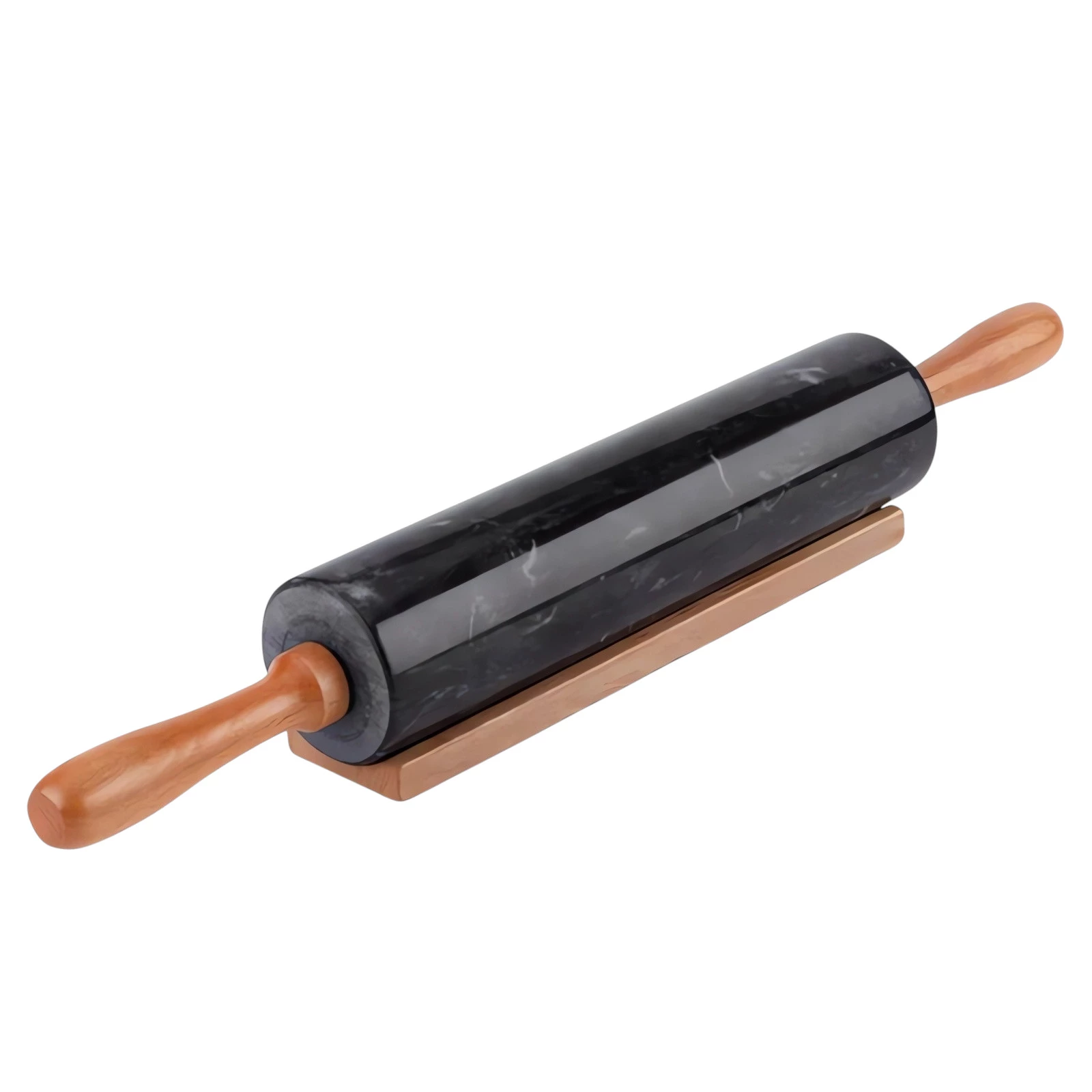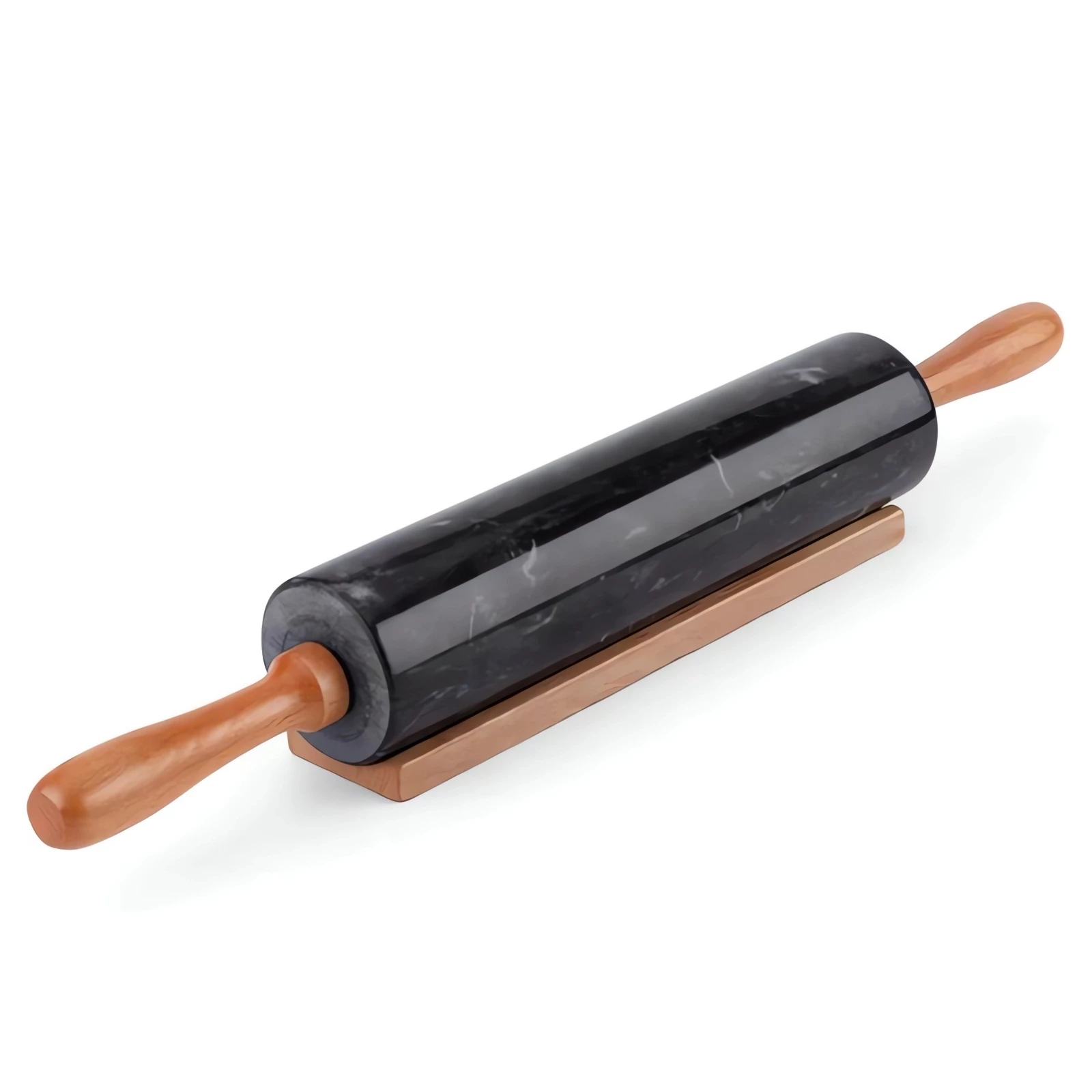 Mramorový valček s drevenými rukoväťami a podložkou.