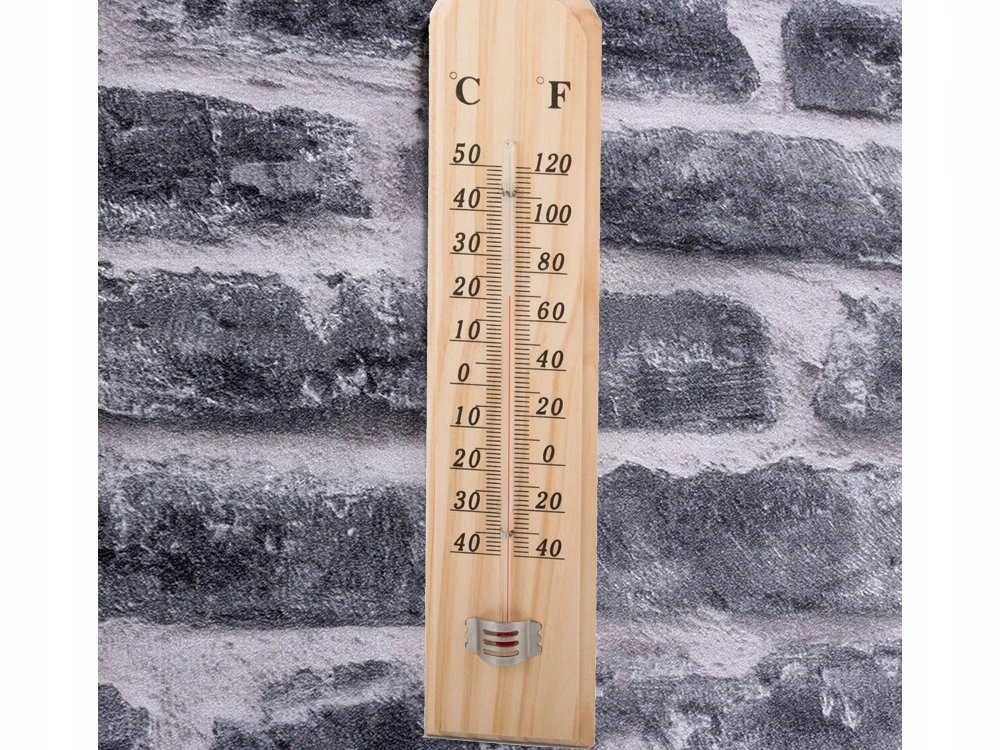 Drevený závesný teplomer. Bude presne merať teplotu mimo budovy aj vo vnútri miestností. Teplotný rozsah -40 až +50 stupňov Celzia (40 až 120 stupňov Fahrenheita).