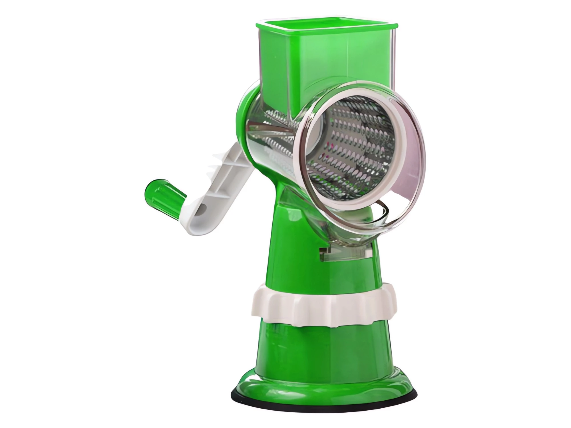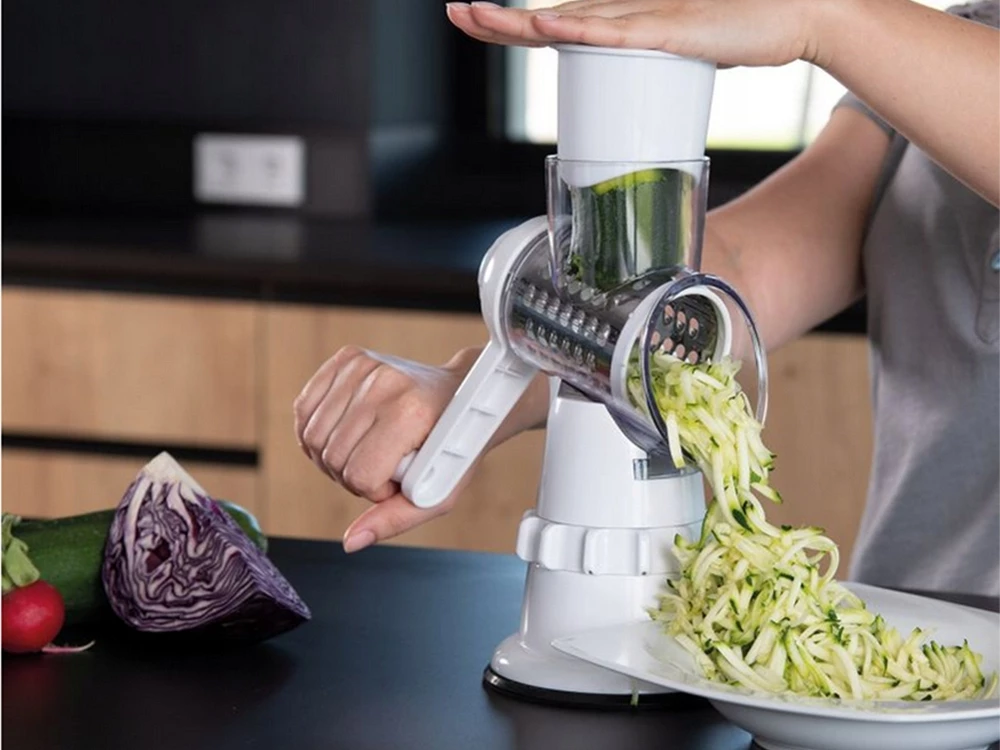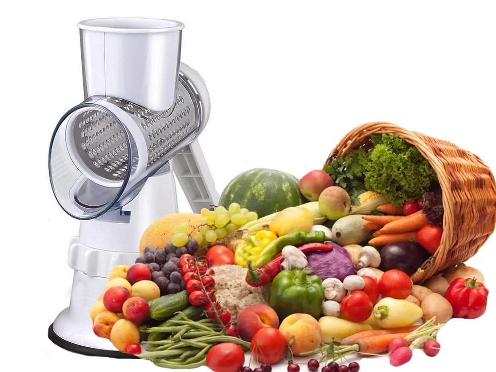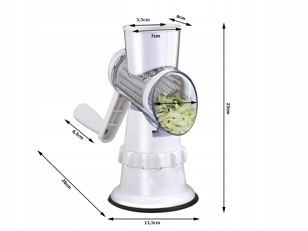 Vďaka mechanizmu, ktorý ponúka tento ručný strúhadlo, nadobudne vaše strúhanie a krájanie úplne nový rozmer. Do dávkovacej nádobky vložíte požadovanú zeleninu alebo ovocie a kľučkou na strúhadle potom otáčate smerom k sebe. Zo strúhadla vám následne vyjde krásne nastrúhaná zelenina alebo ovocie. Ponúkaný krájač je zariadenie, ktoré by nemalo chýbať v žiadnej kuchyni. Vďaka nemu veľmi rýchlo a efektívne zvládnete kuchynské úlohy. Zariadenie sa výborne hodí na prípravu zeleninových šalátov, prírodných chipsov alebo prísad do zeleninových omáčok a polievok. Stroj sa veľmi ľahko používa. Pripevníme ho pomocou prísavky na povrch, napr. stôl alebo pracovnú dosku. Prísavka zabezpečuje, že strúhadlo sa nehýbe a je stabilné. Krájač je vybavený tromi nástavcami. Vložte príslušný nástavec do priehľadného otvoru zariadenia a nasaďte rukoväť.