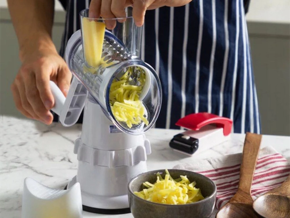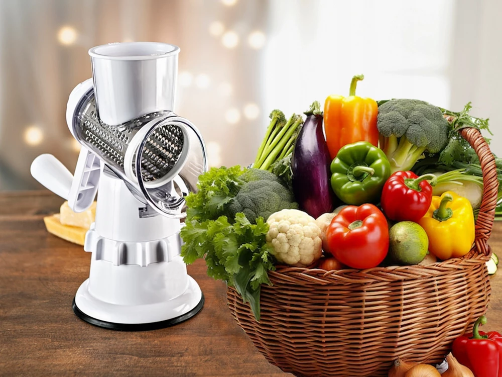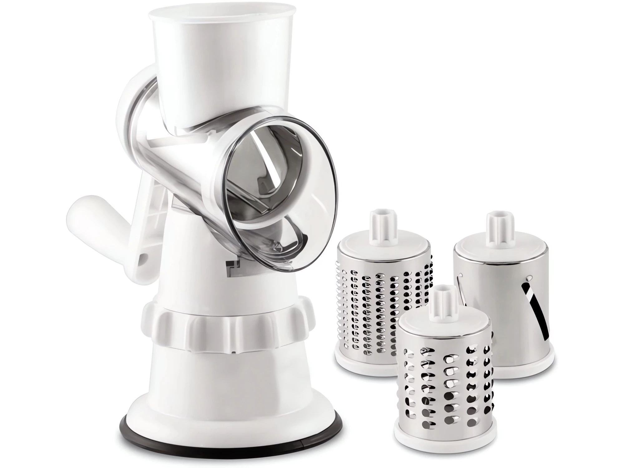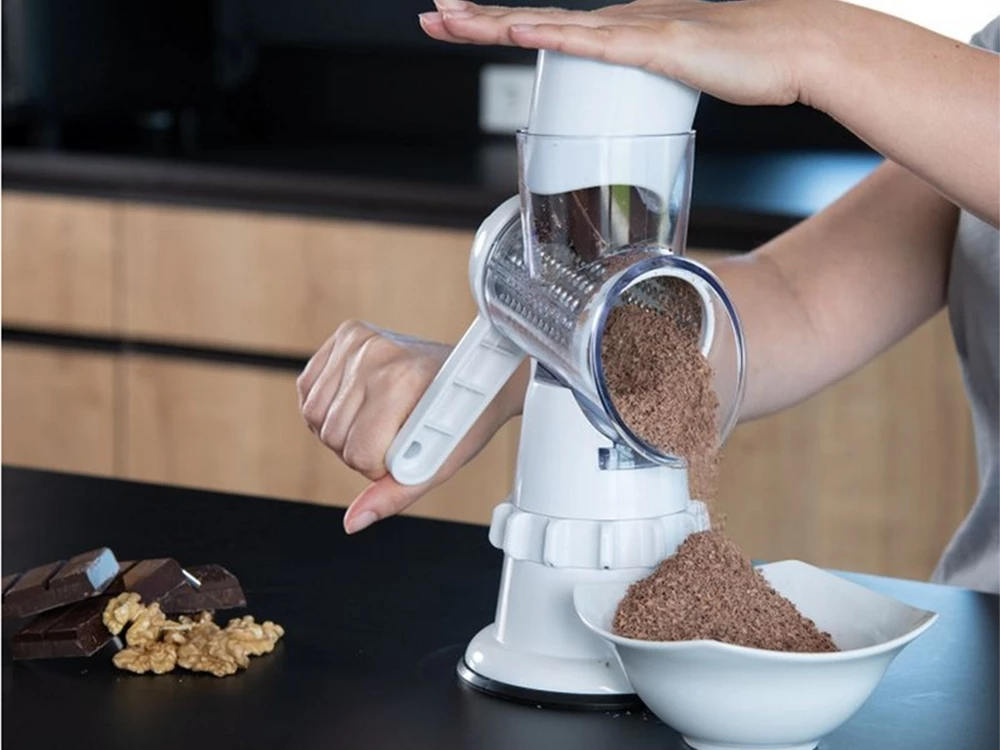 Vďaka mechanizmu, ktorý ponúka tento ručný strúhadlo, nadobudne vaše strúhanie a krájanie úplne nový rozmer. Do dávkovacej nádobky vložíte požadovanú zeleninu alebo ovocie a kľučkou na strúhadle potom otáčate smerom k sebe. Zo strúhadla vám následne vyjde krásne nastrúhaná zelenina alebo ovocie. Ponúkaný krájač je zariadenie, ktoré by nemalo chýbať v žiadnej kuchyni. Vďaka nemu veľmi rýchlo a efektívne zvládnete kuchynské úlohy. Zariadenie sa výborne hodí na prípravu zeleninových šalátov, prírodných chipsov alebo prísad do zeleninových omáčok a polievok. Stroj sa veľmi ľahko používa. Pripevníme ho pomocou prísavky na povrch, napr. stôl alebo pracovnú dosku. Prísavka zabezpečuje, že strúhadlo sa nehýbe a je stabilné. Krájač je vybavený tromi nástavcami. Vložte príslušný nástavec do priehľadného otvoru zariadenia a nasaďte rukoväť.