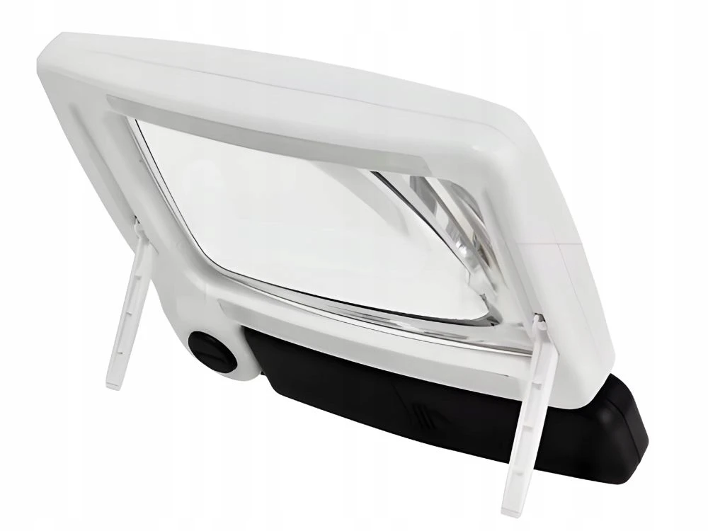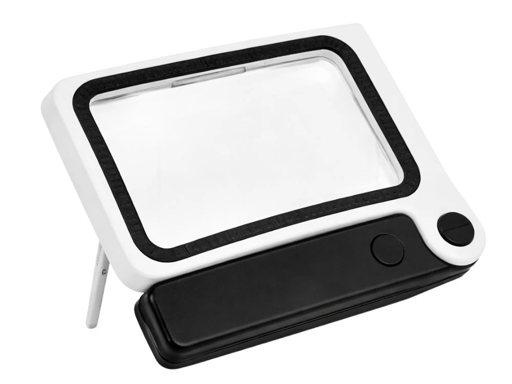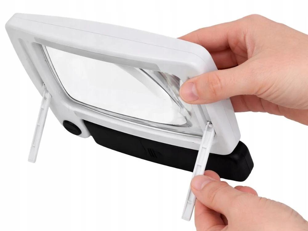 Zariadenie má skladaciu konštrukciu a špeciálne nožičky na zadnej strane umožňujú, aby lupa stabilne stála na stole. Je to veľmi pohodlné riešenie pre dlhšie čítanie alebo prácu.