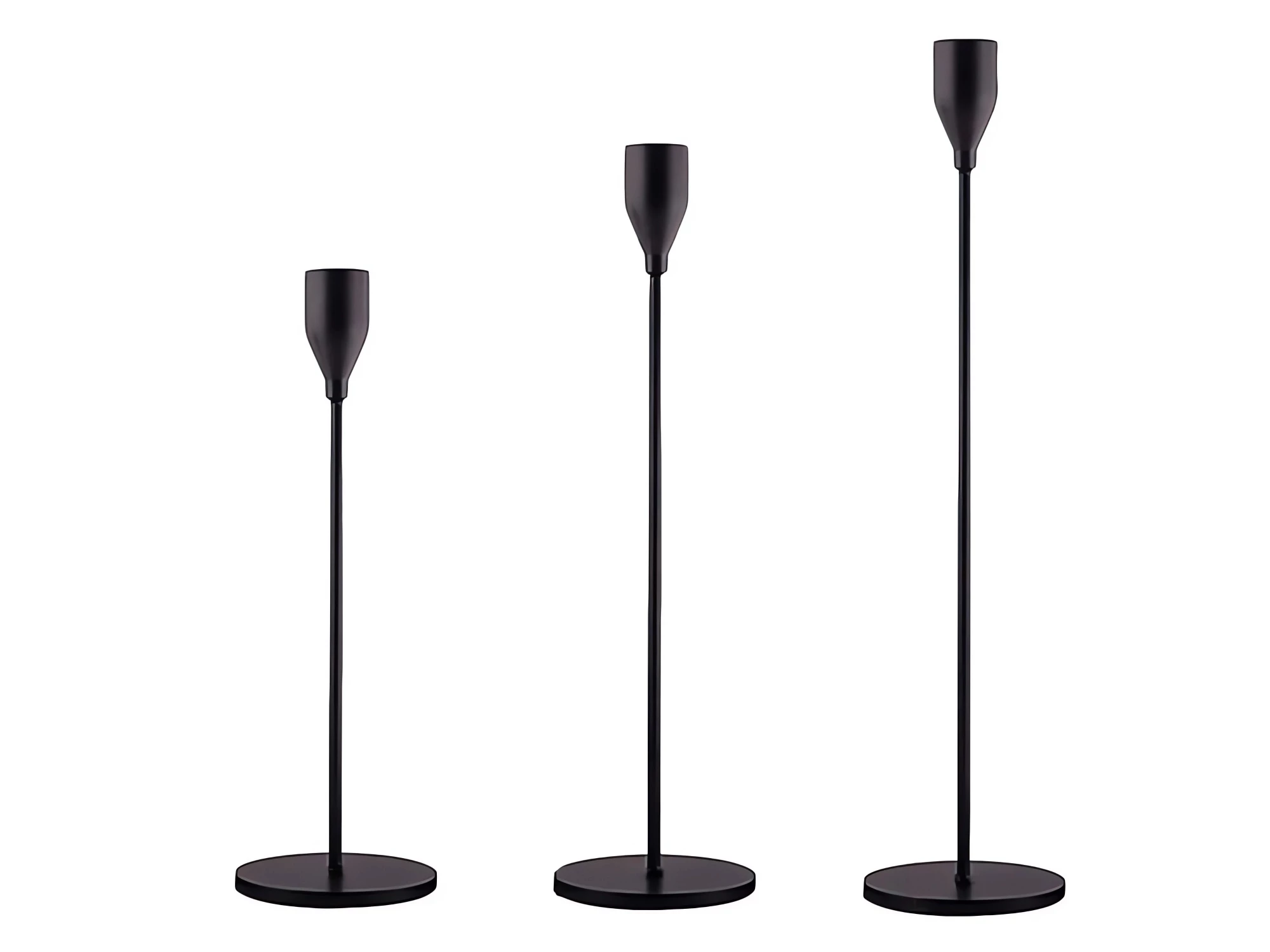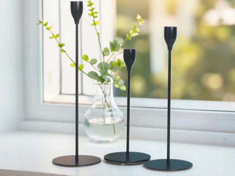 Svietniky sú vyrobené z vysoko kvalitného kovu s práškovým nástrekom v matnej čiernej farbe, vďaka čomu sú odolné proti poškriabaniu a majú dlhú životnosť. Pevná základňa zaručuje stabilitu aj pri použití vyšších sviečok. Jednoduchý, ale premyslený dizajn ich robí ideálnymi dekoráciami na stôl, komodu, parapet alebo poličku.